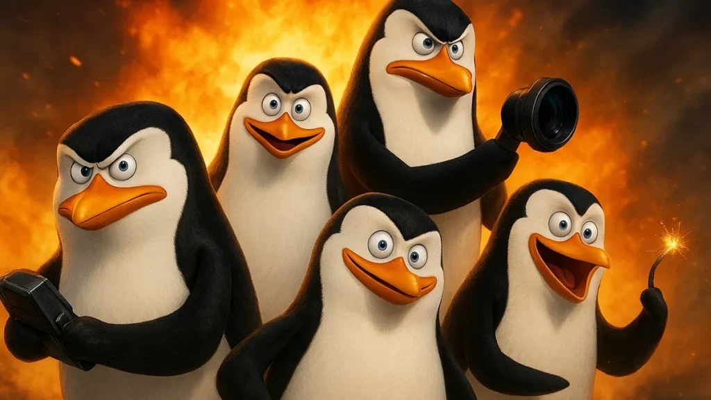 Os pinguins aparecem como líderes de operação, cada um com personalidade definida. Há o estrategista, o executor, o engraçado e o otimista. Essa divisão facilita identificação rápida e rende piadas constantes.