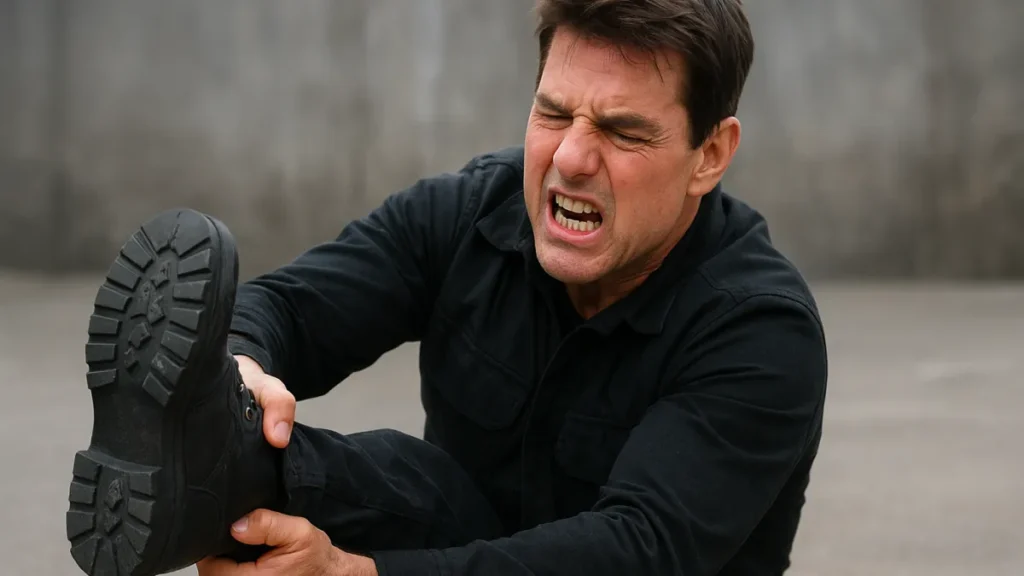 No salto, a aterrissagem foi ruim: Tom Cruise torceu e fraturou o tornozelo. Foi um ferimento imediato e visível, que forçou a interrupção das filmagens e atendimento no local.